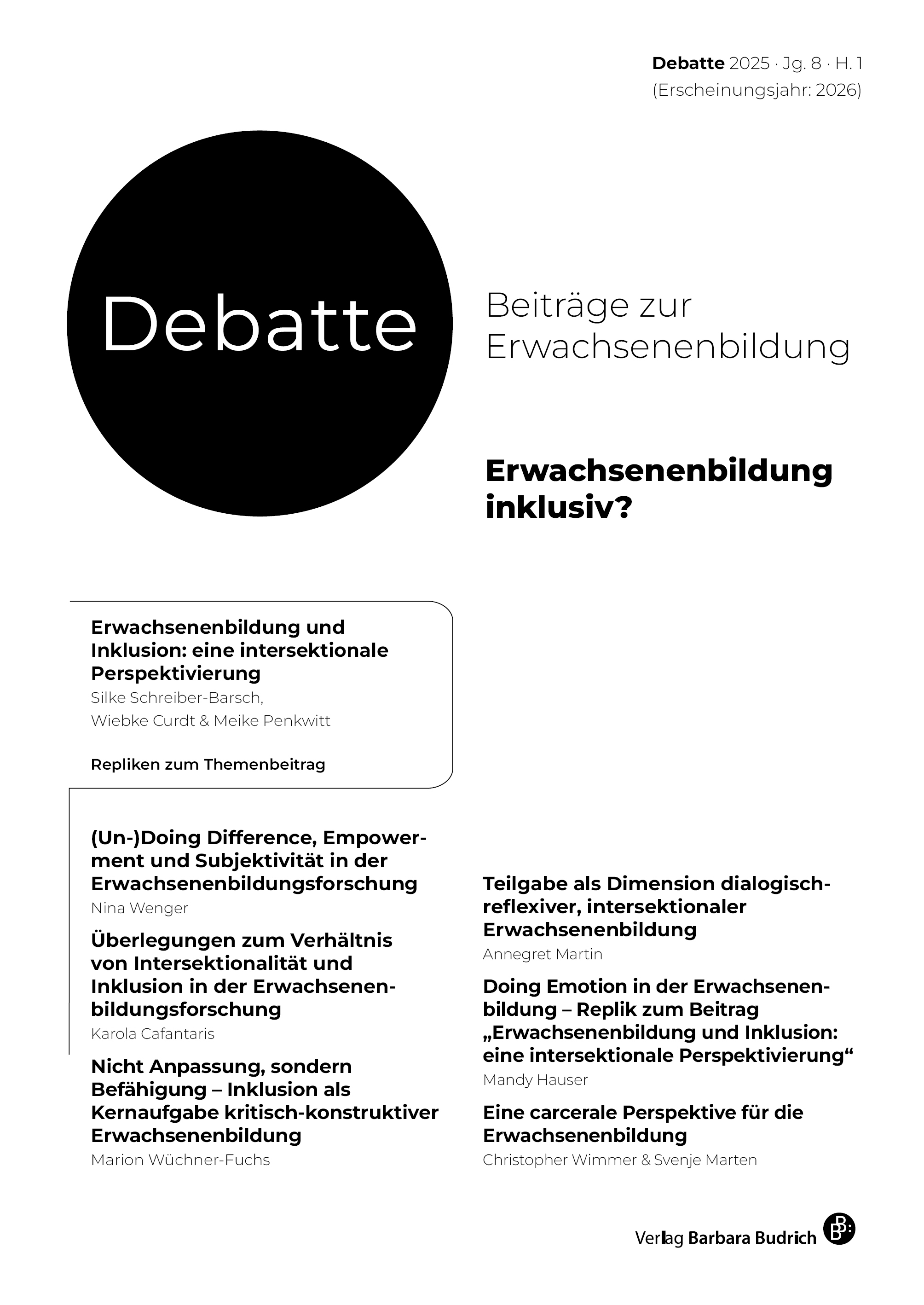 Die Zeitschrift Debatte. Beiträge zur Erwachsenenbildung hat den Anspruch, den diskursiven Austausch innerhalb der Erwachsenenbildung voranzutreiben sowie disziplinübergreifende Verschränkungen zu kultur- und sozialwissenschaftlichen Ansätzen aufzugreifen und auszubauen.
