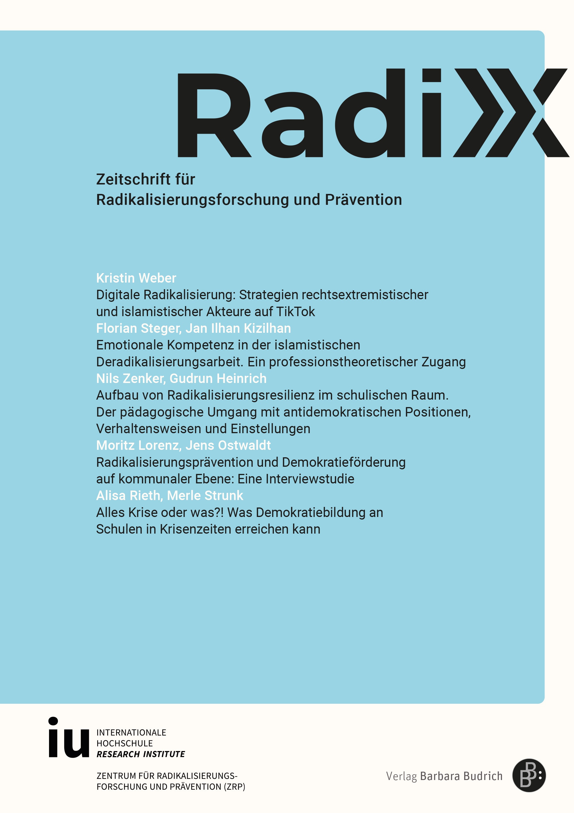 Die Veröffentlichung einer Fachzeitschrift stellt einen Schritt dar, um eine Plattform für den Austausch von Wissen und Erkenntnissen zu schaffen. Beiträge der RadiX befassen sich mit den neuesten Entwicklungen in der Radikalisierungsforschung, die interdisziplinäre Ansätze und kritische Analysen beinhalten, und die zur Entwicklung effektiver Präventionsstrategien beitragen. Insbesondere sind wir an Beiträgen interessiert, die innovative Methoden, theoretische Fortschritte sowie praxisorientierte Fallstudien präsentieren. Die eingereichten Beiträge sollen die unterschiedlichen Dimensionen dieses komplexen Themas (Rassismus, Antisemitismus, Terrorismus, Islamismus, Rechtsextremismus sowie weitere Formen von Extremismus, Verschwörungsmythen, aber auch Demokratiebildung, Prävention und Intervention) abbilden, um einen umfassenden Einblick in die Herausforderungen und Lösungsansätze zu ermöglichen.